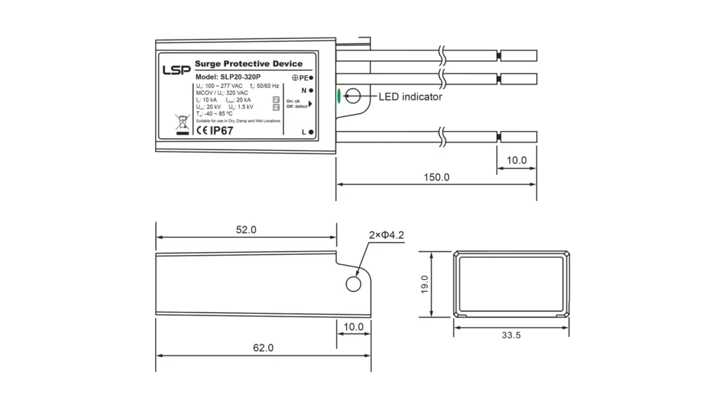 Inline installation, for outdoor/commercial LED lighting, with thermal disconnect and high surge capacity from MOV and GDT for reliable protection.